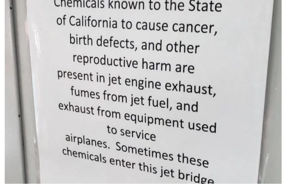 Exhaust fumes from ground equipment and other aircraft entering cockpits and aircraft cabins while aircraft are on the ground is a regular occurrence and as the warning (see below photo) found in a jet bridge at a Californian airport shows, these fumes are extremely harmful to human health.